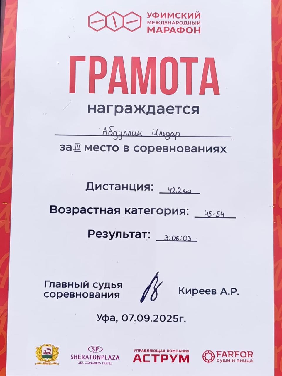 Особого внимания заслуживает выдающийся результат Ильдара Абдуллина, занявшего третье место в своей возрастной категории на самой престижной дистанции марафона — 42,2 км!