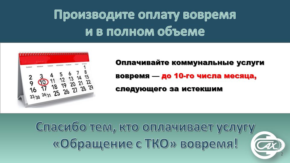Напоминаем, что для своевременного и бесперебойного предоставления коммунальных услуг, включая услугу «Обращение с ТКО», необходимо производить оплату не позднее 10-го числа месяца, следующего за истекшим.